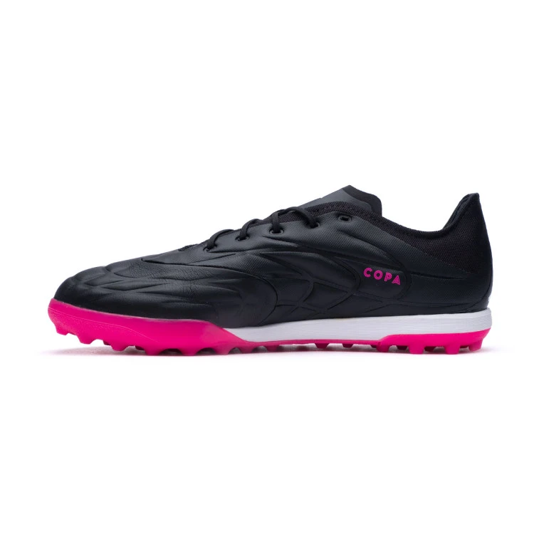 Zapatilla de fútbol adidas Copa Pure.1 Turf para adultos. Zapatillas de piel para utilizar en campos de moqueta, césped artificial, cemento o tierra. Zapatillas de gama alta en color Black-White-Shock Pink para jugadores clásicos.